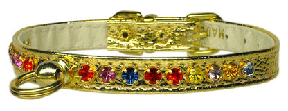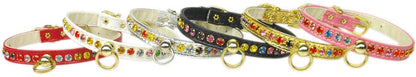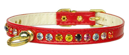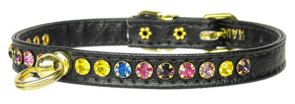 We love the beautiful mixed colored crystals on this dog collar! This ⅜" wide collar is jeweled with one row of sparkling confetti colored crystals, and comes with a center post where an I.D. tag can be attached. This collar is available in an array of sizes and collar colors.