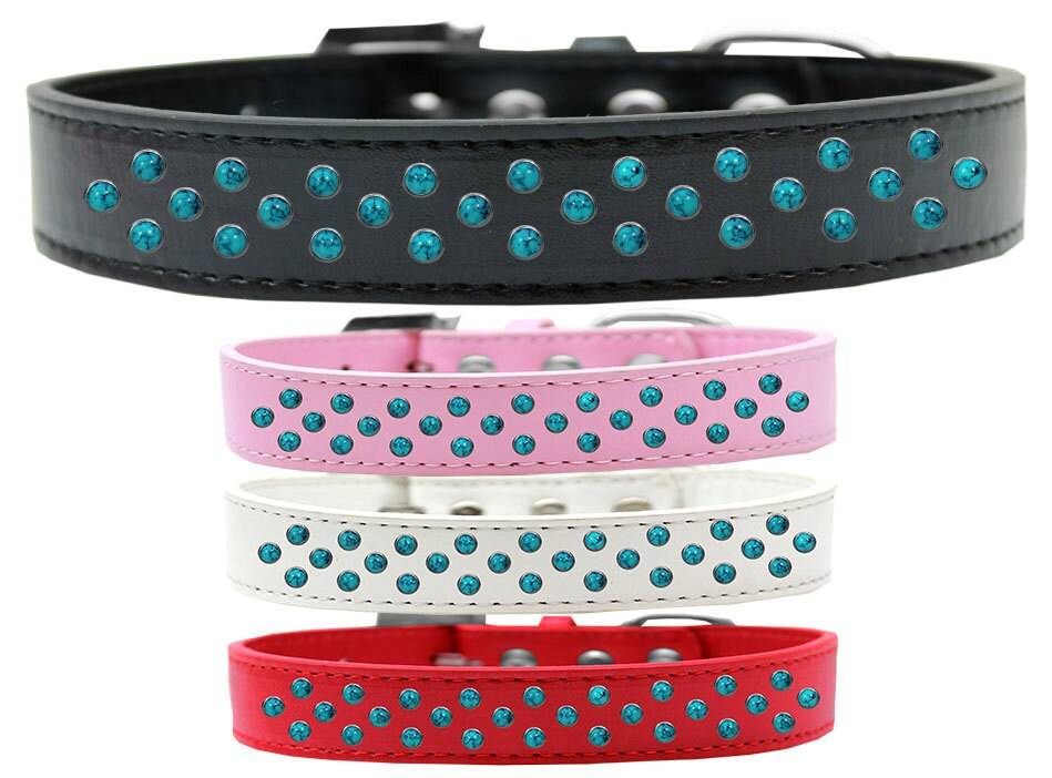 These stellar 3 Row Crystal Collars, which we lovingly call our "Sprinkles" line are a faux leather, featuring crystals around the outside. This collar is available in multiple collar/stone colors, and an array of sizes. These soft collars are 3/4" wide and features three sprinkled rows of crystal stones.