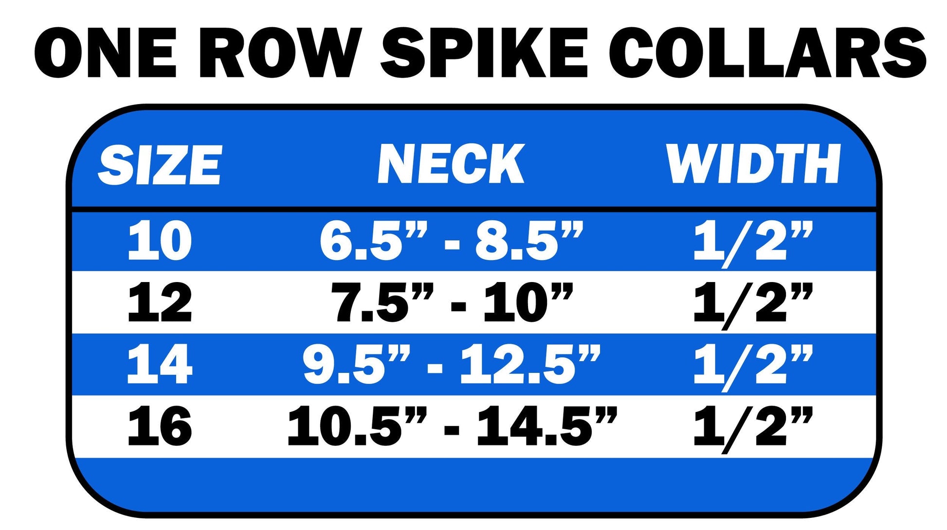 These are 1/2" wide collars with one row of alternating clear crystals and spikes. There is a lot of bling and attitude packed into these collars!